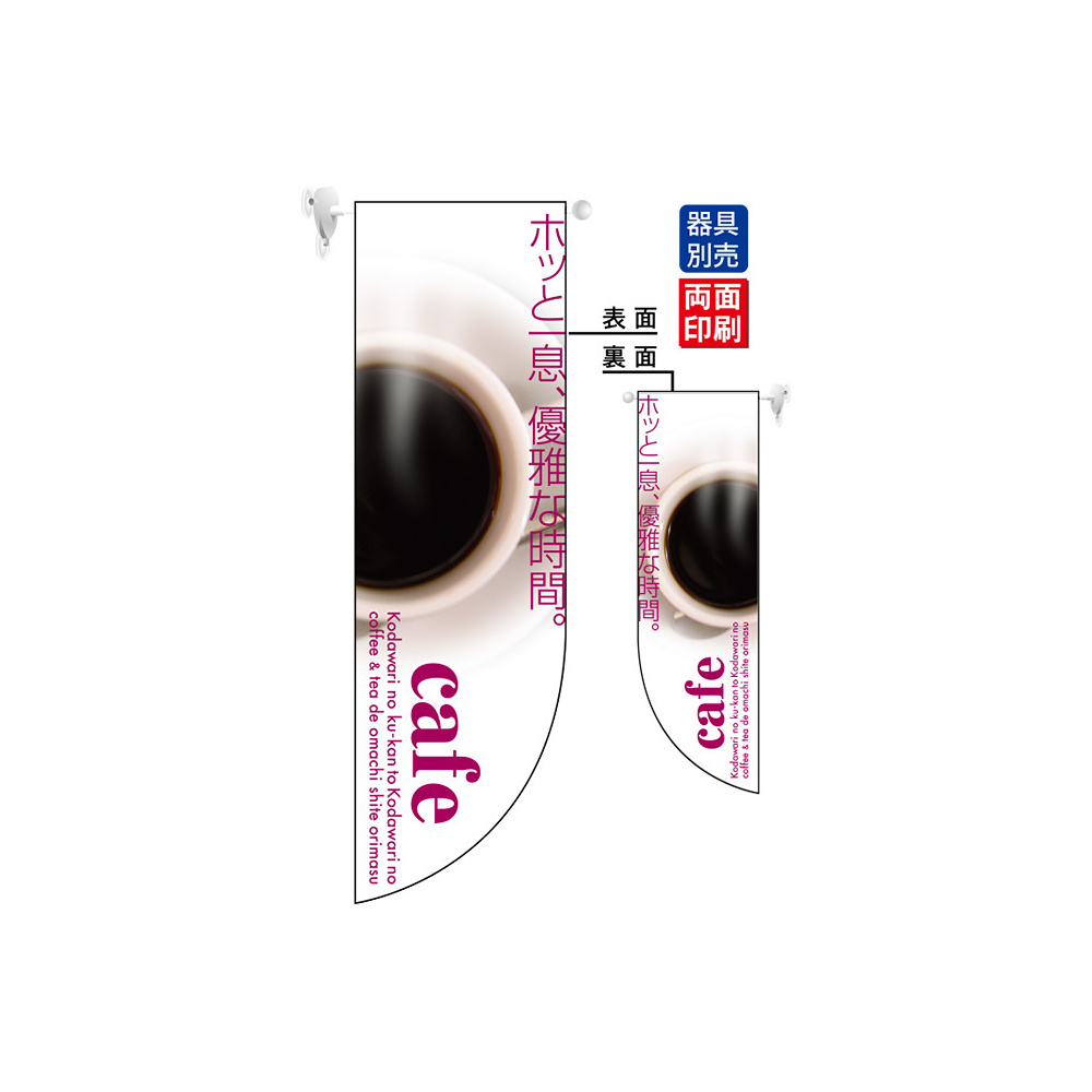 高さ850mmのロングタイプの高級遮光スエード素材に両面印刷した本格派販促フラッグ。表示内容「ホッと一息、優雅な時間 cafe」