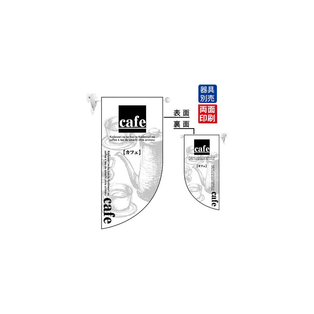 高さ550mmのショートタイプの高級遮光スエード素材に両面印刷した本格派販促フラッグ。表示内容「cafe カフェ」