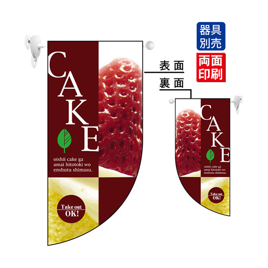 高さ550mmのショートタイプの高級遮光スエード素材に両面印刷した本格派販促フラッグ。表示内容「CAKE」