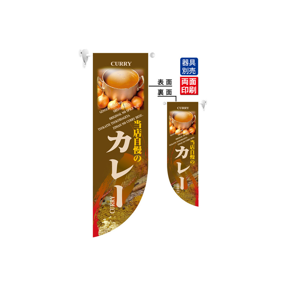 高さ850mmのロングタイプの高級遮光スエード素材に両面印刷した本格派販促フラッグ。表示内容「当店自慢のカレー」