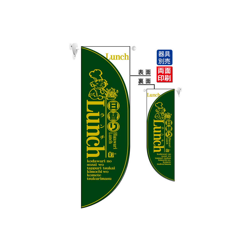 高さ850mmのロングタイプの高級遮光スエード素材に両面印刷した本格派販促フラッグ。表示内容「日替わりランチ LUNCH」