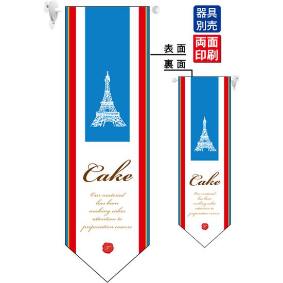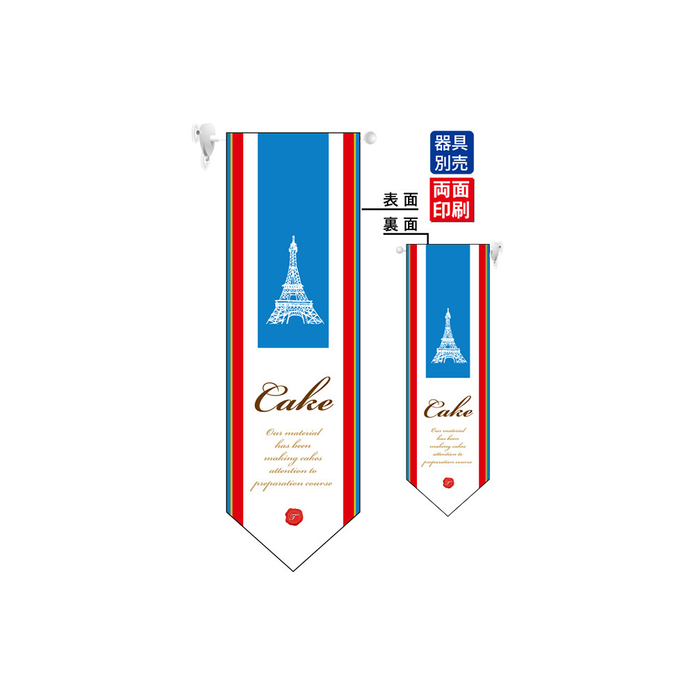 高さ850mmのロングタイプの高級遮光スエード素材に両面印刷した本格派販促フラッグ。表示内容「Cake 塔」