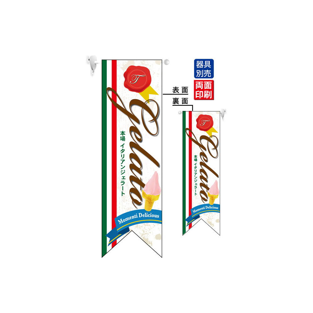 高さ850mmのロングタイプの高級遮光スエード素材に両面印刷した本格派販促フラッグ。表示内容「Gelate ジェラート」