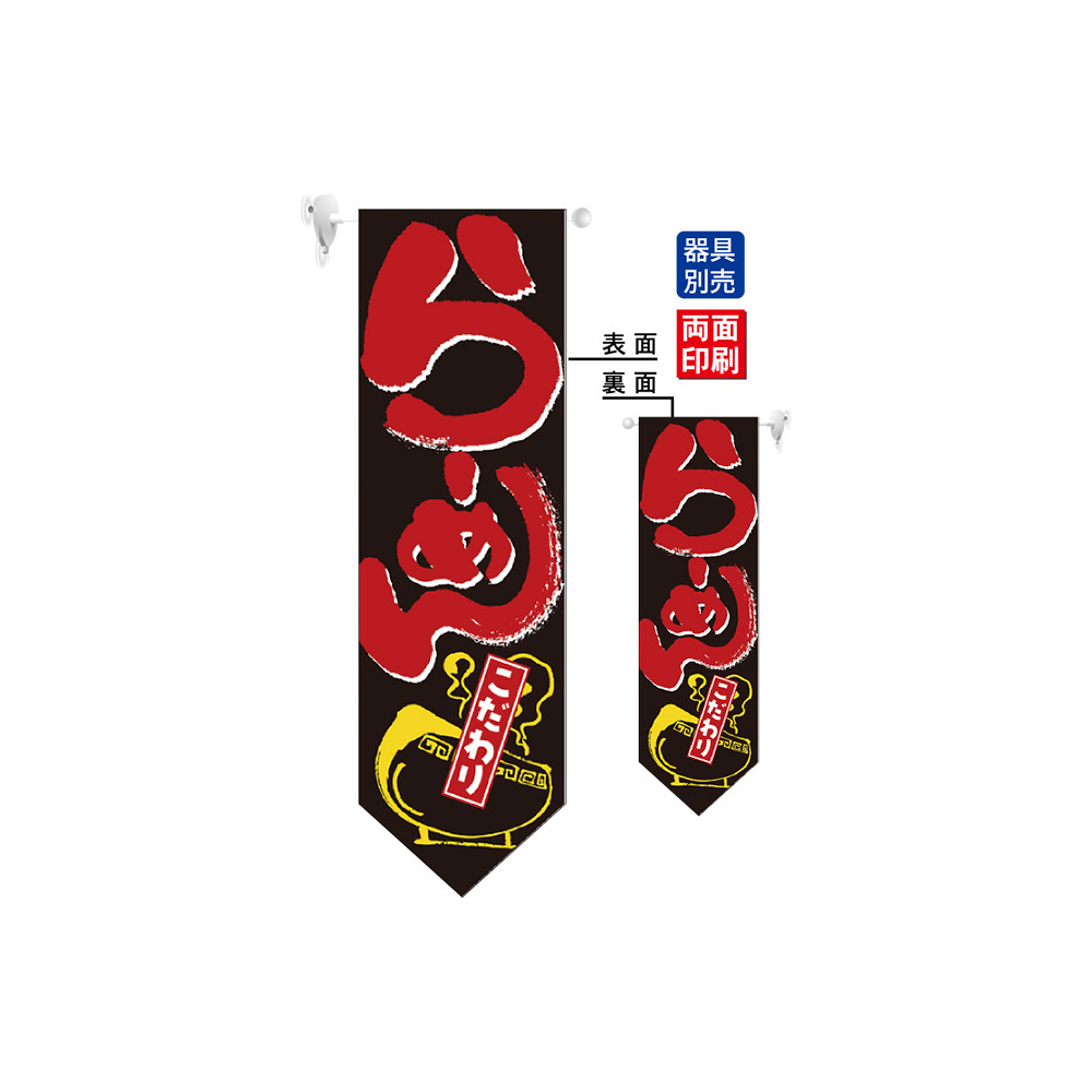 高さ850mmのロングタイプの高級遮光スエード素材に両面印刷した本格派販促フラッグ。表示内容「らーめん こだわり」