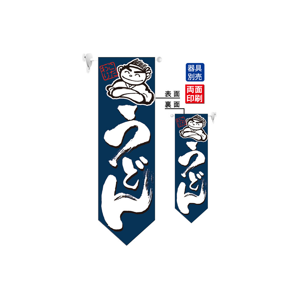 高さ850mmのロングタイプの高級遮光スエード素材に両面印刷した本格派販促フラッグ。表示内容「うどん」