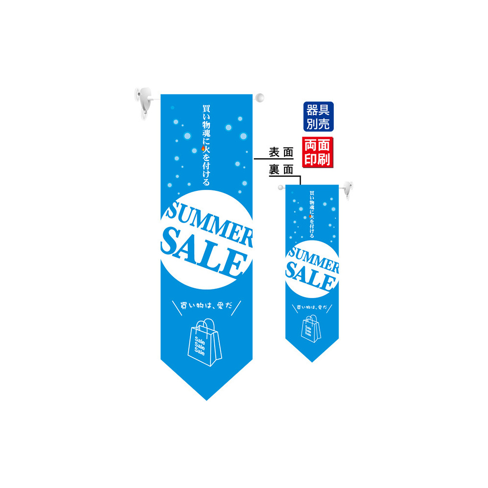 高さ850mmのロングタイプの高級遮光スエード素材に両面印刷した本格派販促フラッグ。表示内容「SUMMER SALE」