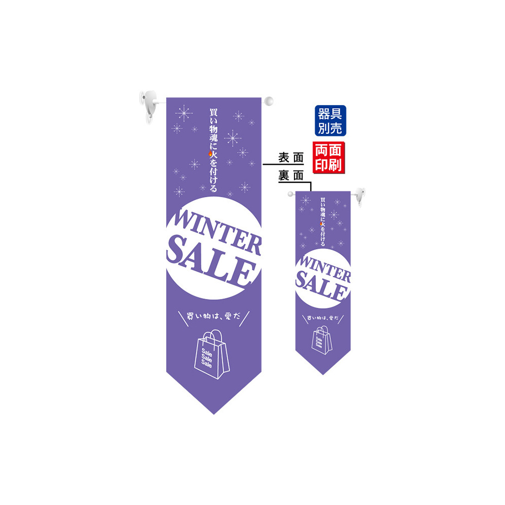 高さ850mmのロングタイプの高級遮光スエード素材に両面印刷した本格派販促フラッグ。表示内容「WINTER SALE」