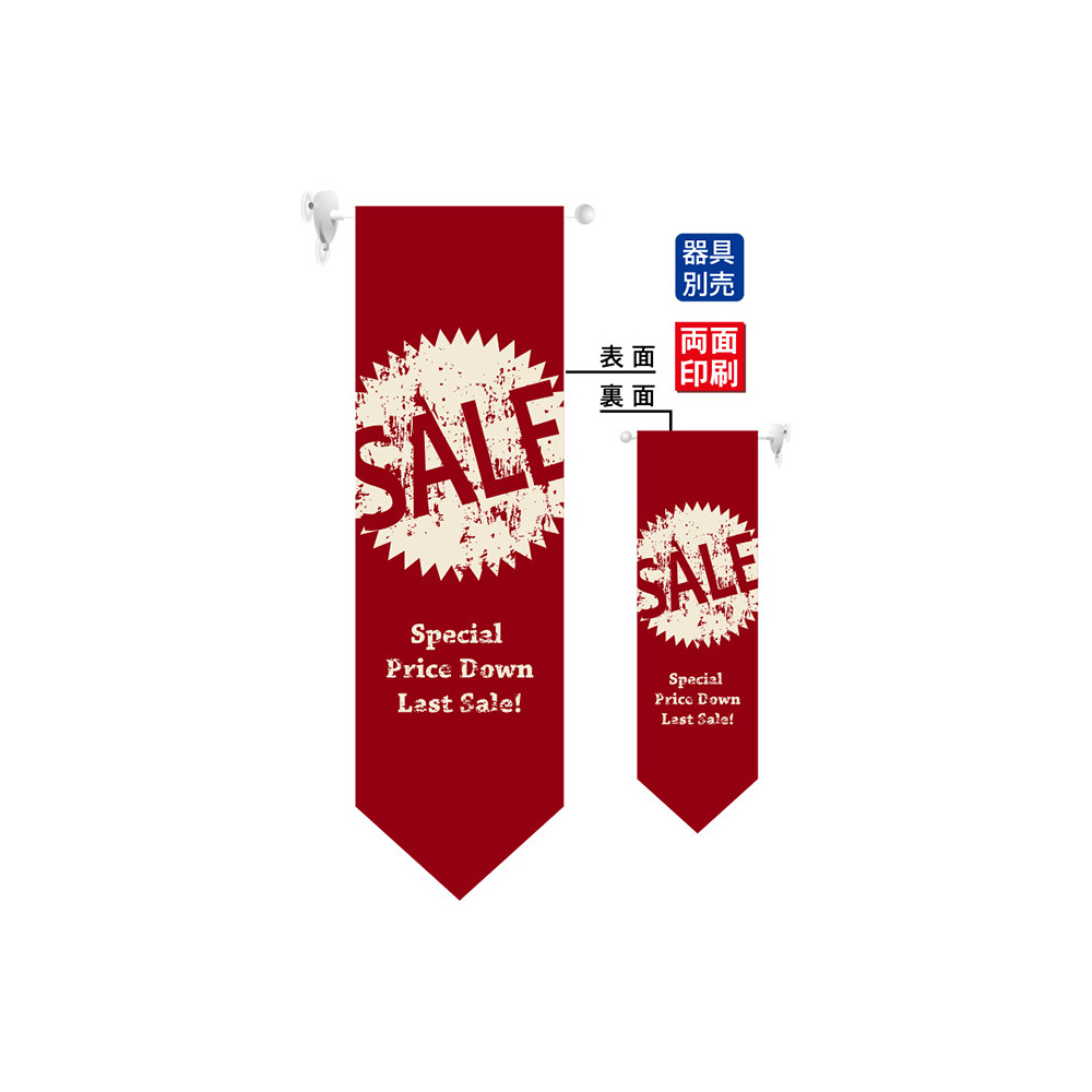 高さ850mmのロングタイプの高級遮光スエード素材に両面印刷した本格派販促フラッグ。表示内容「SALE」