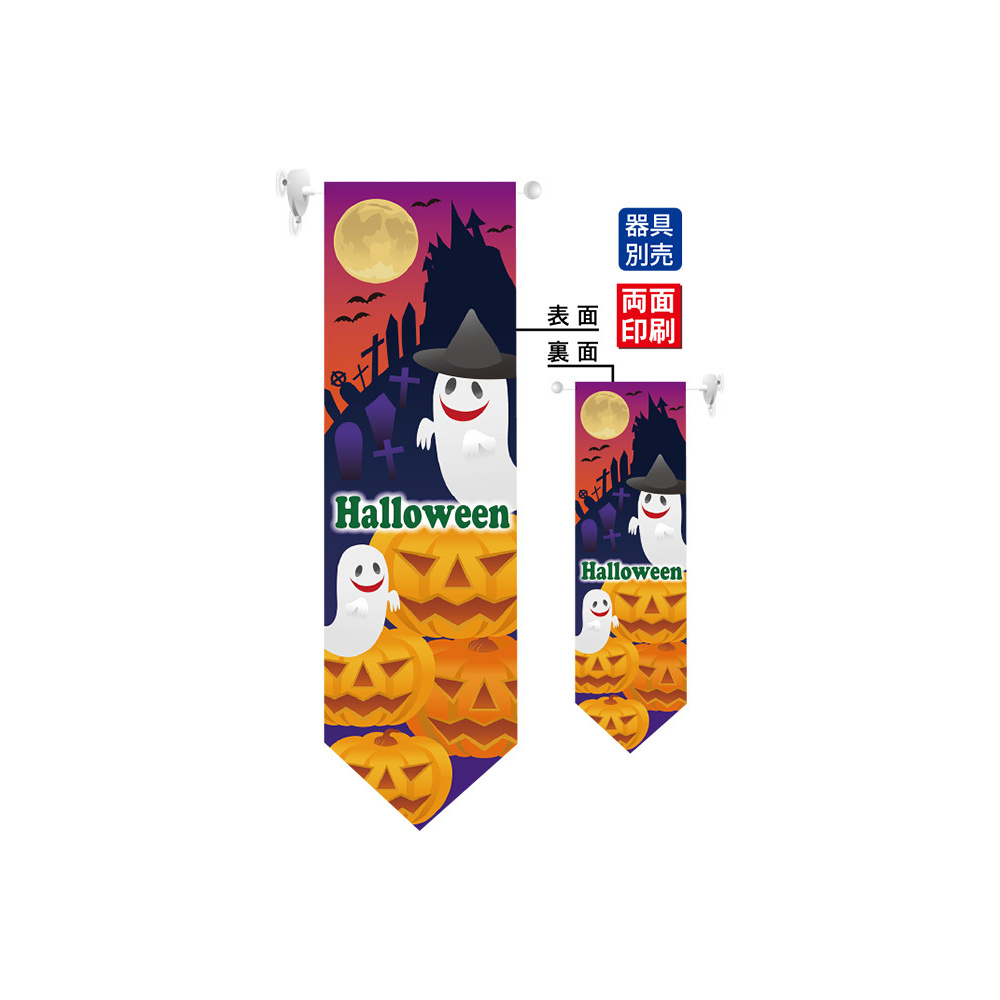 高さ850mmのロングタイプの高級遮光スエード素材に両面印刷した本格派販促フラッグ。表示内容「ハロウィン お化け」