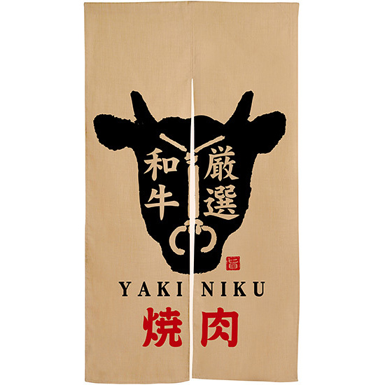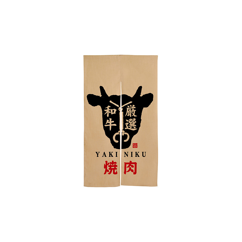 商品説明:【新商品】焼肉 牛柄 赤文字 エステル麻のれん (3575)