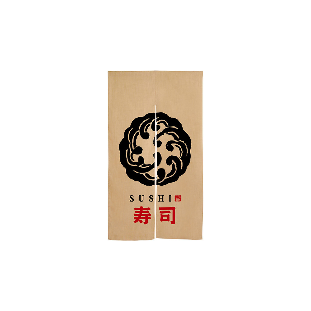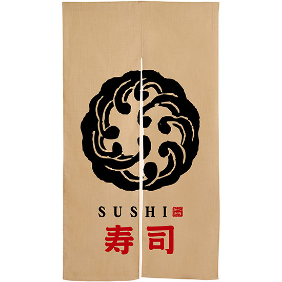 商品説明:寿司 波柄 赤文字 エステル麻のれん (3576)