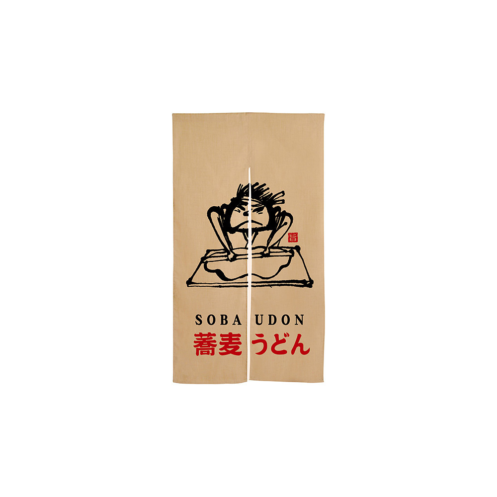 商品説明:蕎麦うどん イラスト 赤文字 エステル麻のれん (3579)