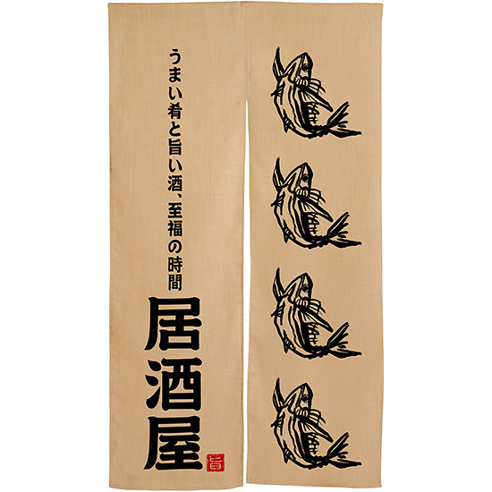 商品説明:居酒屋 魚柄 黒文字 エステル麻のれん (3583)