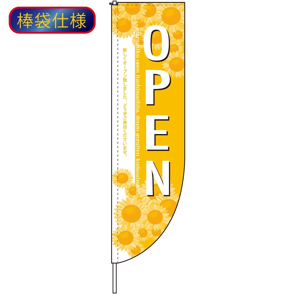 のぼりの下部がスマートにカーブしているRのぼり旗。内容は黄色地にOPENの文字。ひまわりのイラストが夏にピッタリのオシャレのぼり旗です。 カフェやレストランの店頭にぜひ。