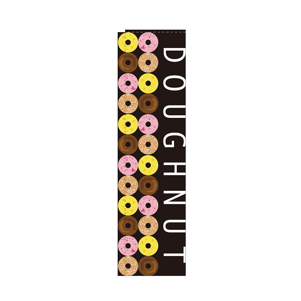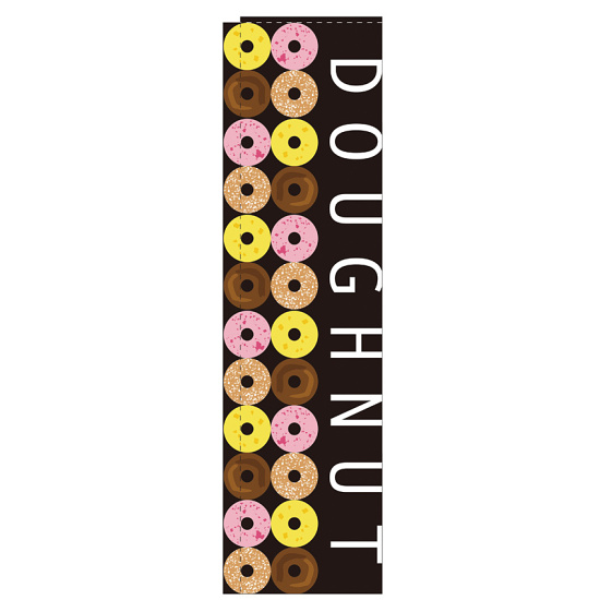 見た目にもキャッチーなドーナッツのぼり旗です。 おっと目を引くユニークなデザインでお客様の視線を店舗に向けさせます。 またこちらののぼり旗は45cm幅のスリムなのぼり旗です。