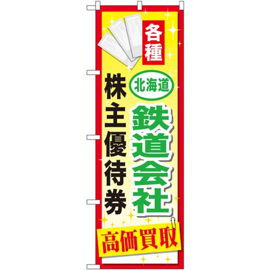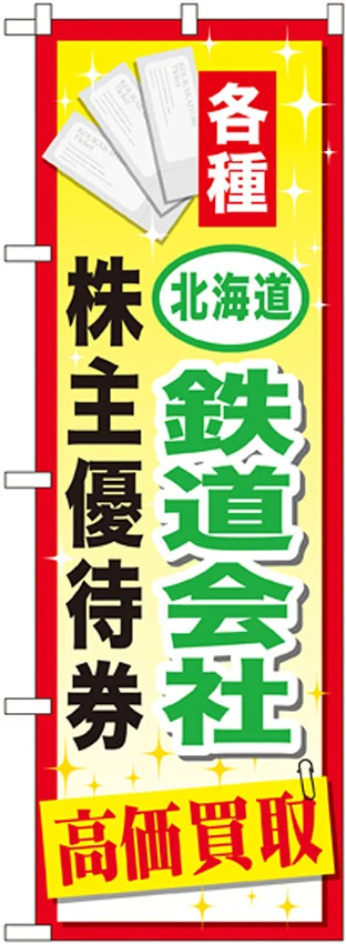 「金券ショップ向けのぼり旗 内容:北海道鉄道会社~優待券 (GNB-2094)」の導入をご検討中ですか? 大量注文・複数台のご検討に応じたお見積りのご相談、最短納期や送料、仕様・サイズの確認など、 株主優待券 のぼり旗選びをまとめてサポートいたします。
