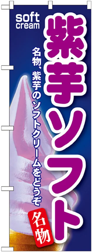 「のぼり旗 紫芋ソフト (SNB-115)」の導入をご検討中ですか? 大量注文・複数台のご検討に応じたお見積りのご相談、最短納期や送料、仕様・サイズの確認など、 アイス・ソフトクリーム のぼり旗選びをまとめてサポートいたします。