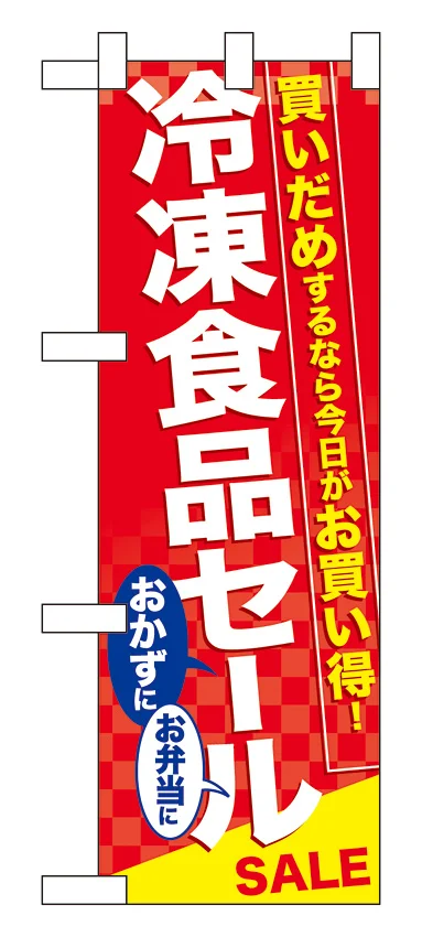 「ハーフのぼり旗 冷凍食品セール (60061)」の導入をご検討中ですか? 大量注文・複数台のご検討に応じたお見積りのご相談、最短納期や送料、仕様・サイズの確認など、 食料品 ハーフのぼり旗選びをまとめてサポートいたします。