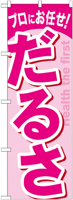 「のぼり旗 だるさ (GNB-1346)」の導入をご検討中ですか? 大量注文・複数台のご検討に応じたお見積りのご相談、最短納期や送料、仕様・サイズの確認など、 エステ・マッサージ・整体 のぼり旗選びをまとめてサポートいたします。