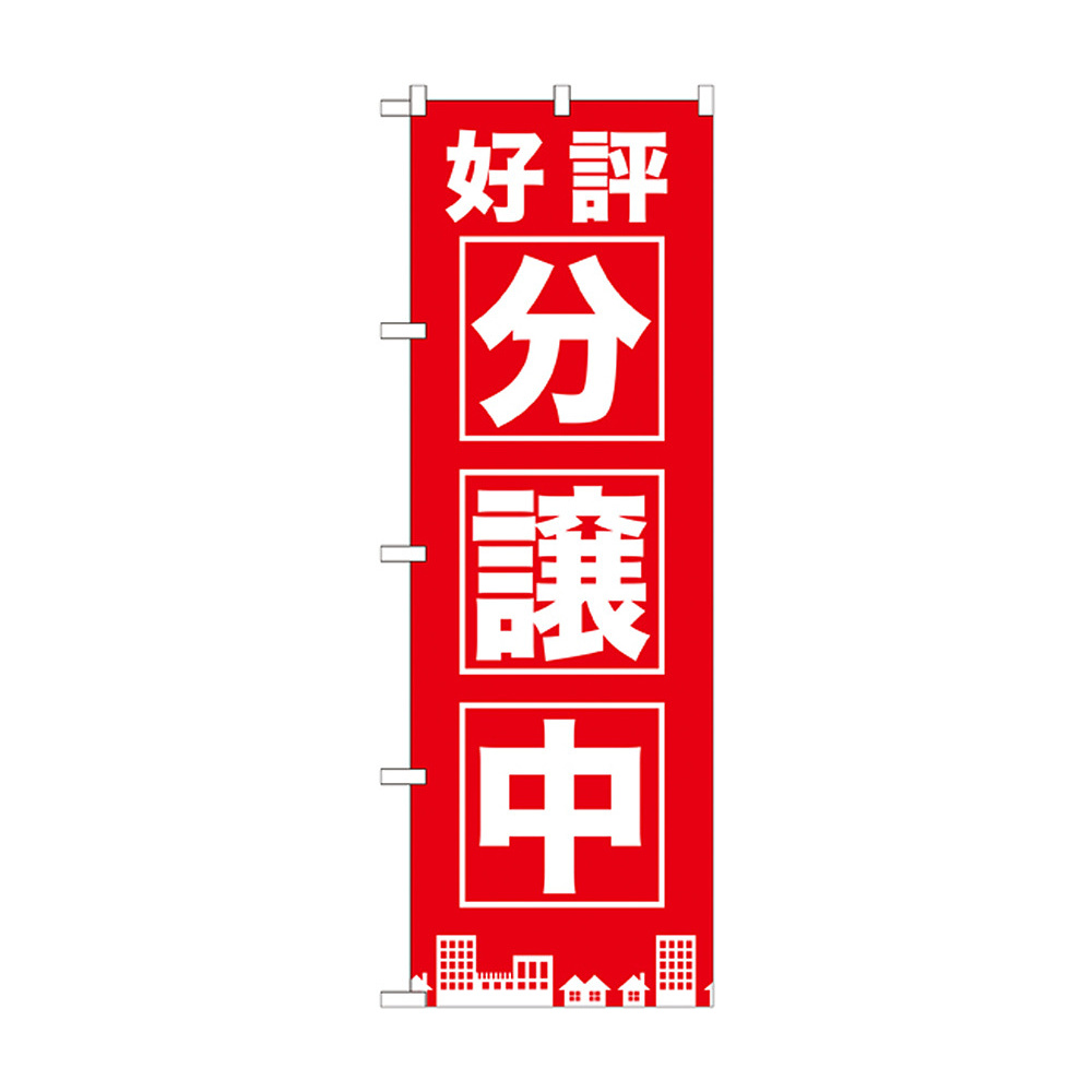 不動産関係ののぼり旗です。 上部に「好評」、真ん中に大きく「分譲中」と表記してあります。 遠目から見てアイキャッチ抜群ののぼり旗ですので不動産屋さんのPRにぜひ。