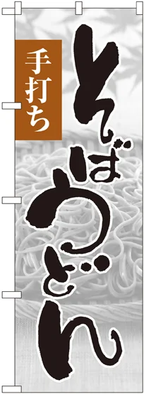 店舗やお店を盛り上げるのぼり旗。表示内容は、そばうどん 手打ち 写真です。