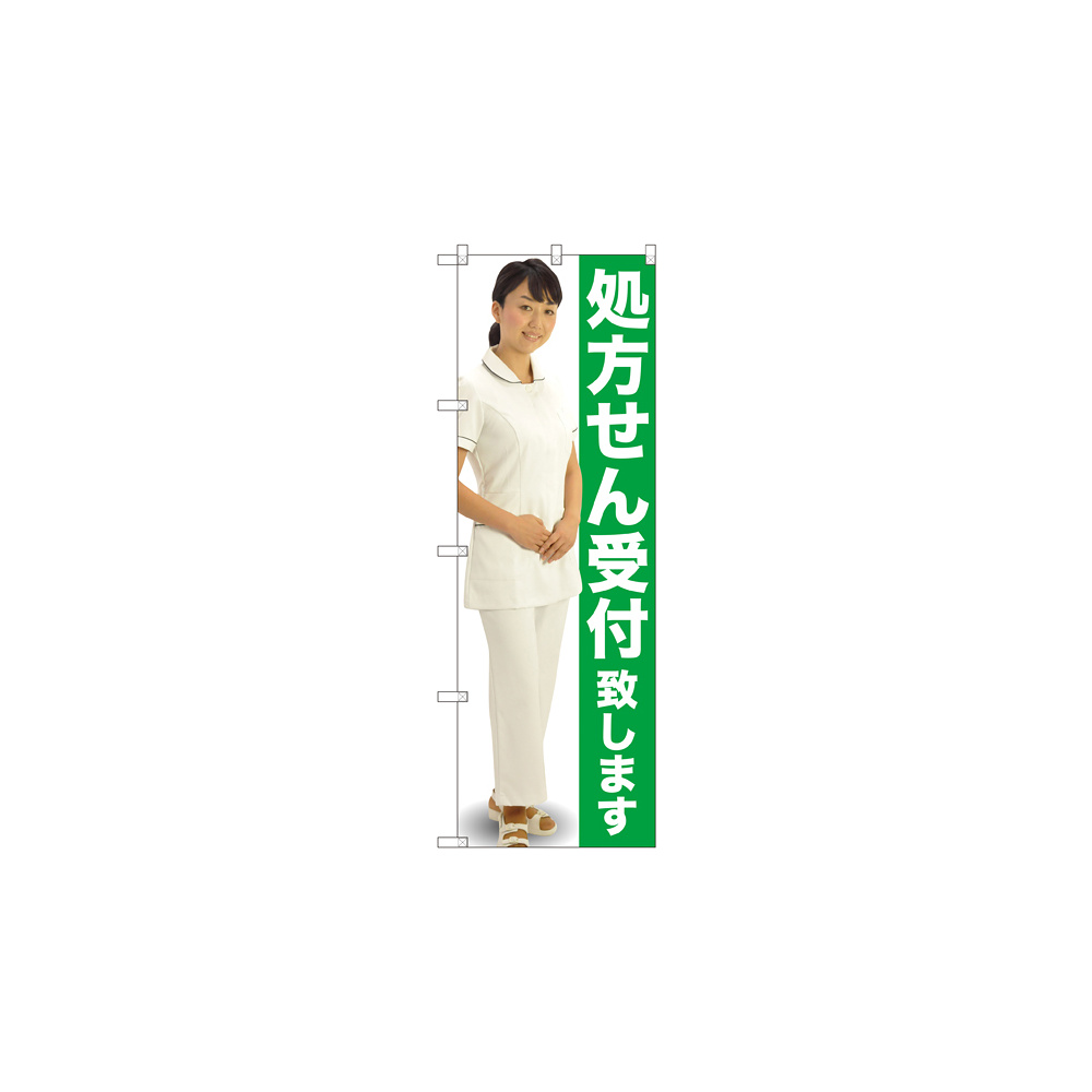店舗やお店を盛り上げるのぼり旗。表示内容は、処方せん受付致しますです。