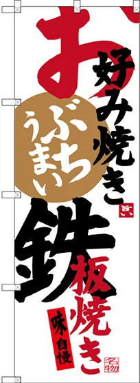 店舗やお店を盛り上げるのぼり旗。表示内容は、お好み焼き鉄板焼きです。