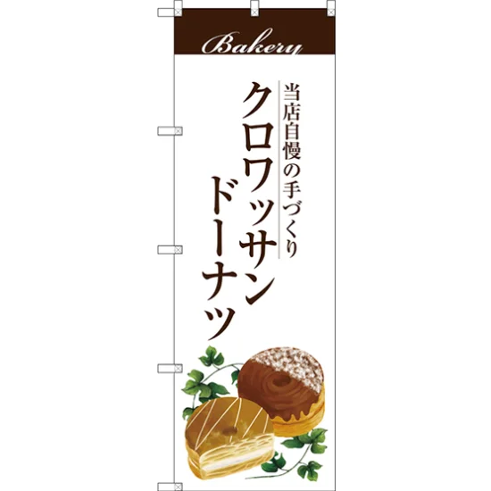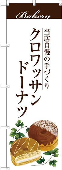 クロワッサンドーナツをアピールする洋菓子店にオススメののぼり旗です。洋菓子店の他、ドーナツショップやパン屋さんなどでもクロワッサンドーナツをPRされたい店舗にぜひ!