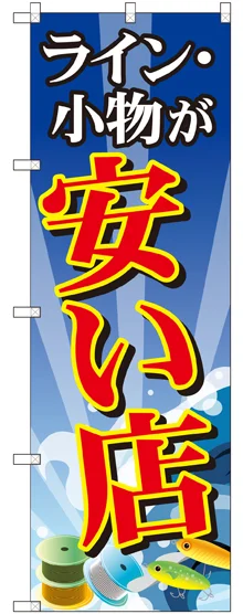店舗やお店を盛り上げるのぼり旗。表示内容は、ライン・小物が安い店です。
