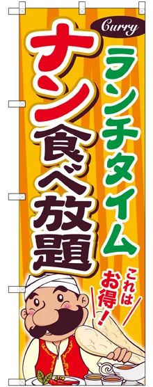 店舗やお店を盛り上げるのぼり旗。表示内容は、ナン食べ放題 ランチタイムです。