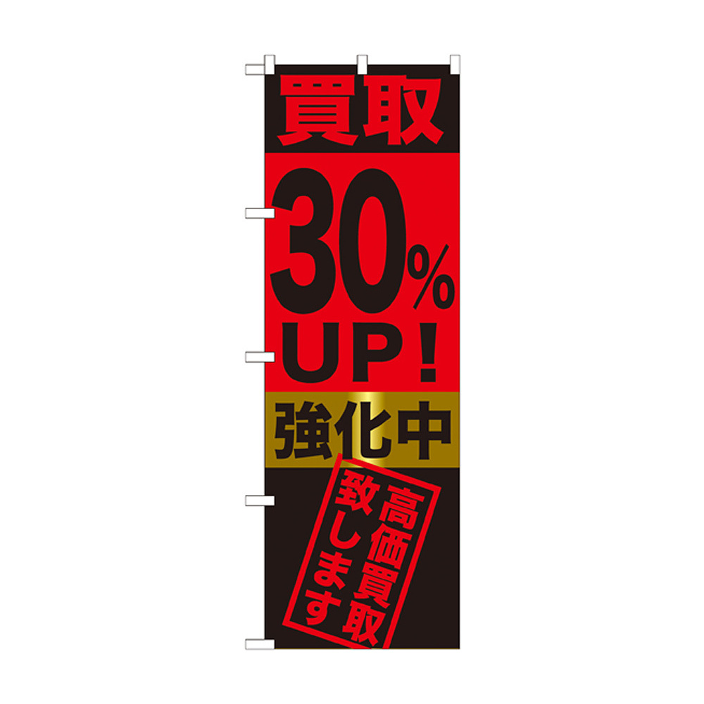 店舗やお店を盛り上げるのぼり旗。表示内容は、買取30%UP!強化中です。