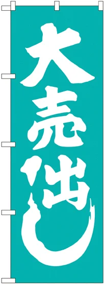 店舗やお店を盛り上げるのぼり旗。表示内容は、大売出し 青緑です。