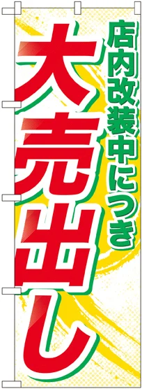 店舗やお店を盛り上げるのぼり旗。表示内容は、店内改装中につき大売出しです。