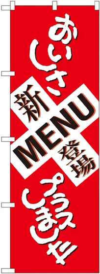 店舗やお店を盛り上げるのぼり旗。表示内容は、新MENU登場 おいしさプラスです。