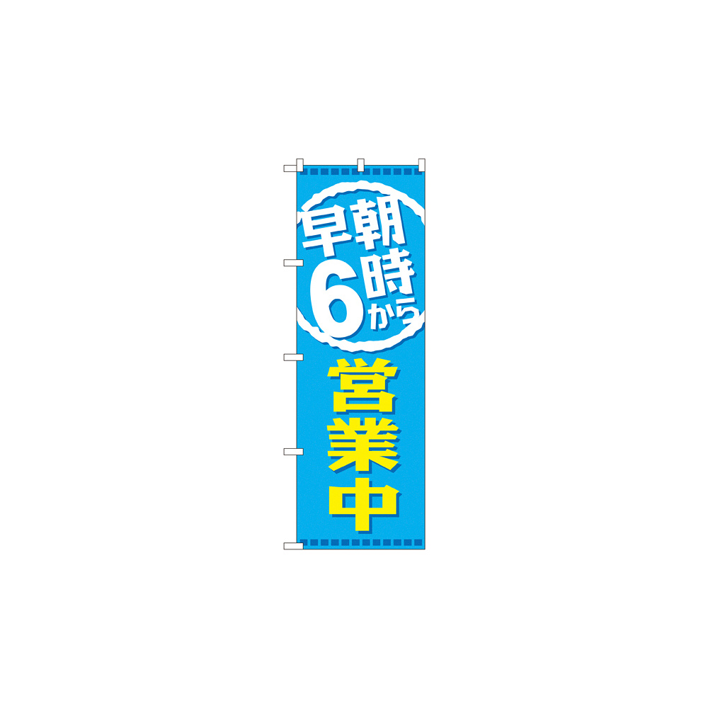 店舗やお店を盛り上げるのぼり旗。表示内容は、早朝6時から営業中です。