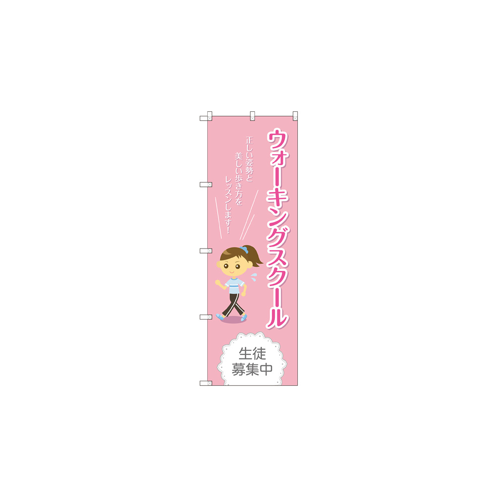店舗やお店を盛り上げるのぼり旗。表示内容は、ウォーキングスクール 生徒募集中です。