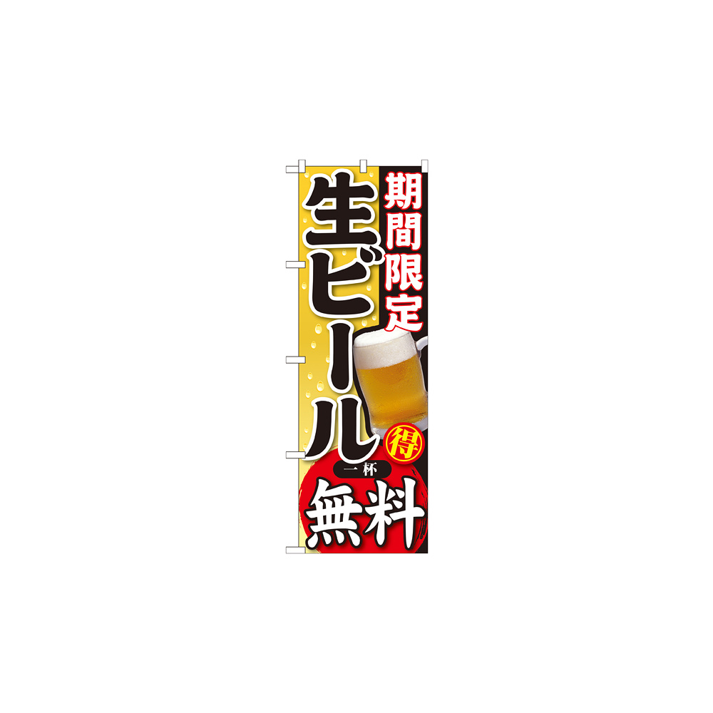店舗やお店を盛り上げるのぼり旗。表示内容は、期間限定 生ビール 一杯無料です。