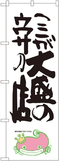 店舗やお店を盛り上げるのぼり旗。表示内容は、ここが大盛のウワサの店 ナマズ柄です。