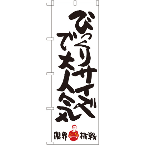 店舗やお店を盛り上げるのぼり旗。表示内容は、びっくりサイズで大人気 限界挑戦です。