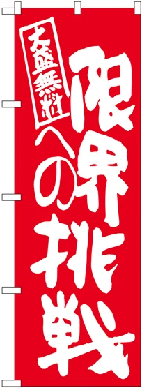 店舗やお店を盛り上げるのぼり旗。表示内容は、限界への挑戦 赤地です。