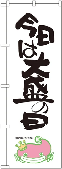 店舗やお店を盛り上げるのぼり旗。表示内容は、今日は大盛の日 ナマズ柄です。