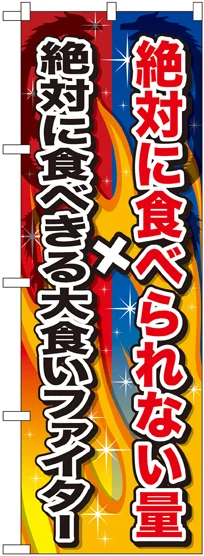 店舗やお店を盛り上げるのぼり旗。表示内容は、絶対に食べられない量×絶対に食べきるです。