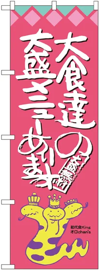 店舗やお店を盛り上げるのぼり旗。表示内容は、大食達の大盛メニューあります オロチ柄です。