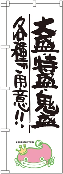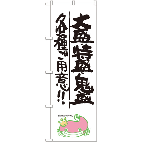 店舗やお店を盛り上げるのぼり旗。表示内容は、大盛 ・特盛 ・鬼盛 各種ご用意!! ナマズ柄です。