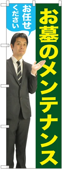 店舗やお店を盛り上げるのぼり旗。表示内容は、お墓のメンテナンスお任せください (男性)です。