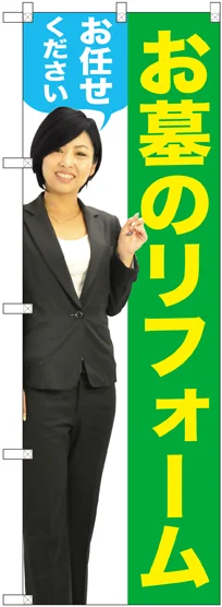 店舗やお店を盛り上げるのぼり旗。表示内容は、お墓のリフォームお任せください (女性)です。