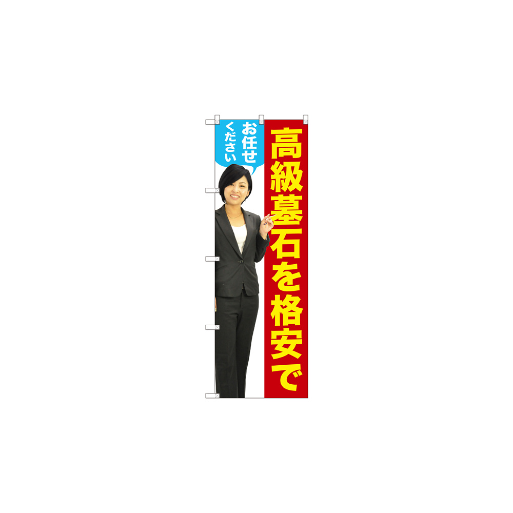 店舗やお店を盛り上げるのぼり旗。表示内容は、高級墓石を格安でお任せください (女性)です。
