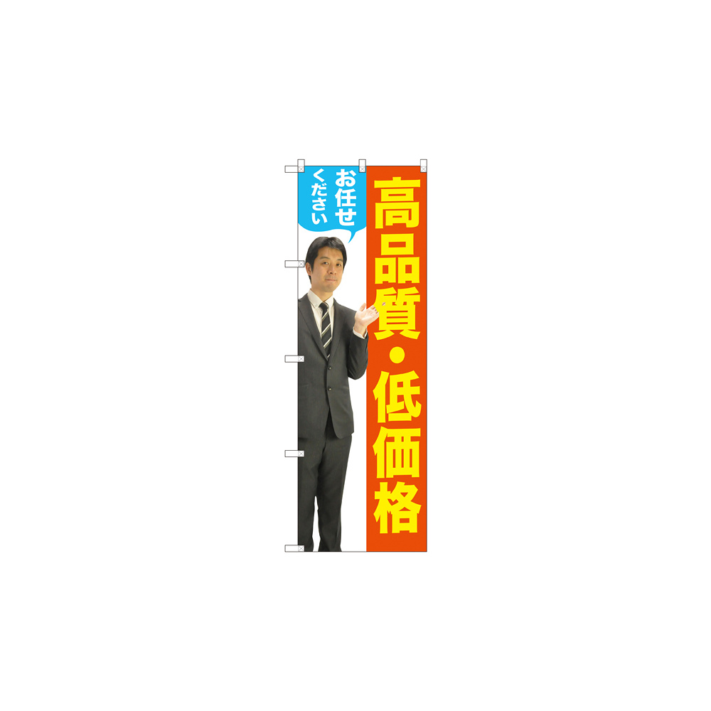 店舗やお店を盛り上げるのぼり旗。表示内容は、高品質・低価格 (男性)です。