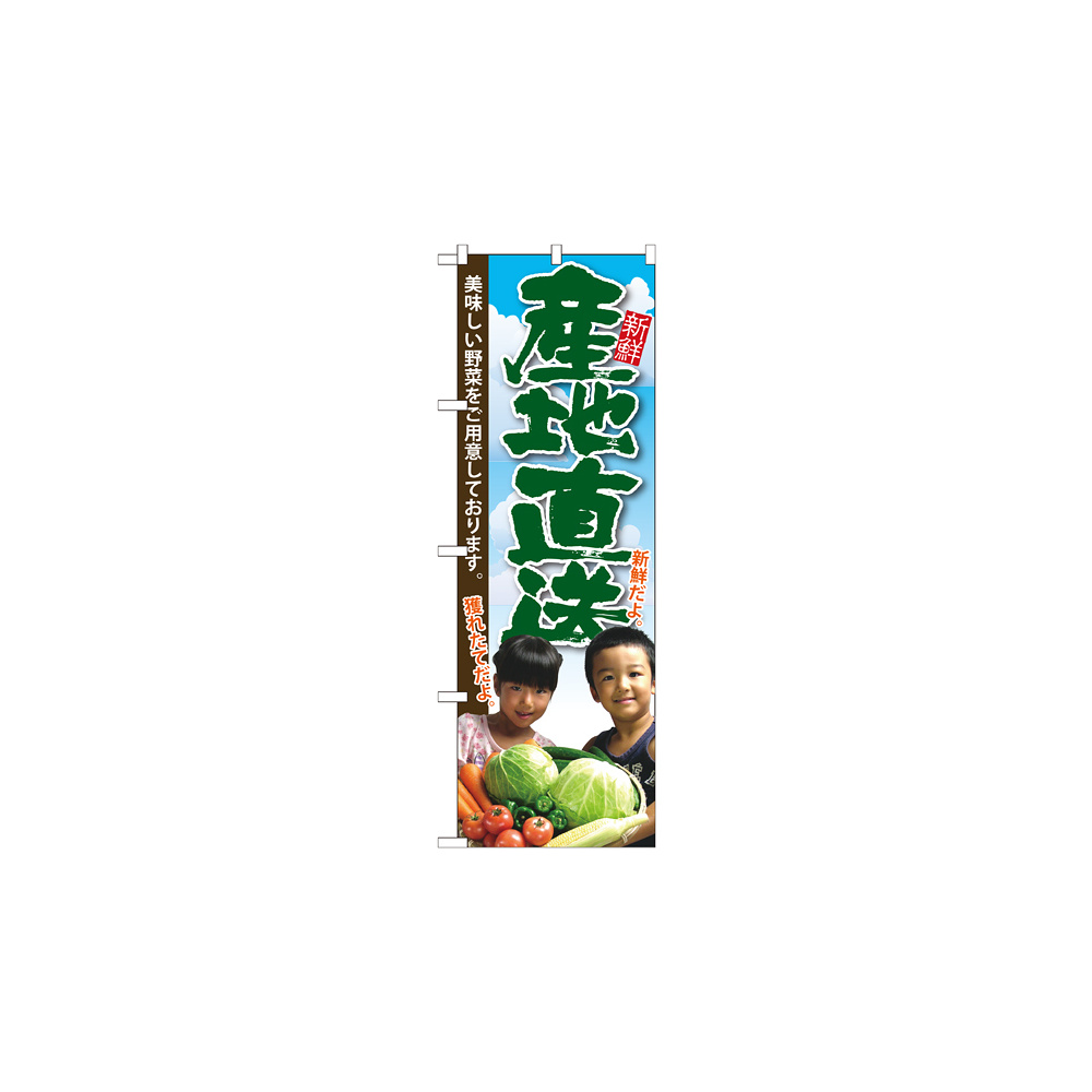店舗やお店を盛り上げるのぼり旗。表示内容は、産地直送 子供写真です。
