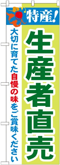 店舗やお店を盛り上げるのぼり旗。表示内容は、特産!生産者直売です。